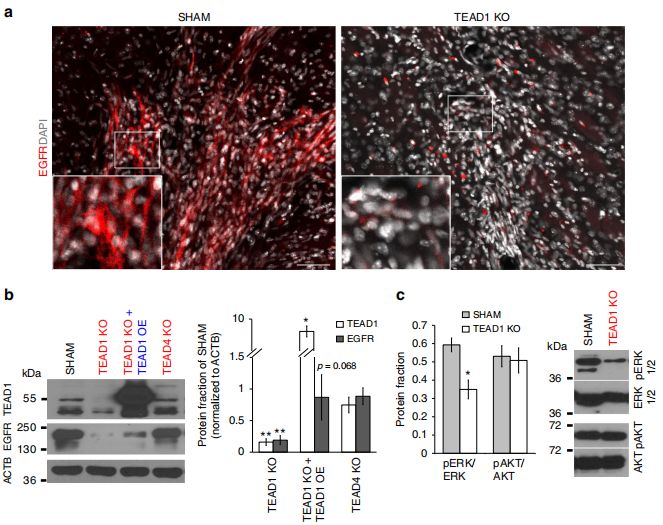TEAD1KO異種移植樣本中EGFR的表達(dá)水平低于對照樣本,且TEAD1KO細(xì)胞系中EGFR表達(dá)相比于正常對照細(xì)胞系顯著下調(diào),TEAD1過表達(dá)后EGFR表達(dá)有回升。對EGFR下游信號元件的表達(dá)水平的檢測發(fā)現(xiàn),pERK在TEAD1KO細(xì)胞中下調(diào),而pAKT則不同。TEAD1KO細(xì)胞經(jīng)過較長時(shí)間的培養(yǎng)后,EGFR表達(dá)恢復(fù),而遷移仍受影響。因此,TEAD1直接且短暫地調(diào)控EGFR。