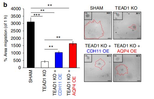 作者通過ATAC-seq和轉(zhuǎn)錄組測序數(shù)據(jù)篩選出來TEAD1的候選靶基因,并進(jìn)一步利用ChIP-PCR,驗(yàn)證了與TEAD1結(jié)合的靶基因–AQP4、EGFRCDH4。TEAD1敲除使AQP4下調(diào),TEAD1過表達(dá)可恢復(fù)AQP4的表達(dá),而TEAD1和AQP4過表達(dá)均可修復(fù)TEAD1KO細(xì)胞的遷移缺陷,說明TEAD1作用于靶基因AQP4,調(diào)控其表達(dá),進(jìn)而參與GBM遷移的直接調(diào)控機(jī)制。