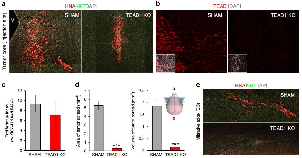 此外,作者分析了所有TEAD家族成員(1-4)在TCGA數(shù)據(jù)庫RNA-seq數(shù)據(jù)中的表達(dá)水平,發(fā)現(xiàn)TEAD1是150個(gè)GBM樣本中表達(dá)最高的TEAD家族成員,且在蛋白水平上,TEAD1在PDX膠質(zhì)瘤中表達(dá)。因此,TEAD1是GBM腫瘤中表達(dá)最高、表達(dá)最廣泛的TEAD家族成員。