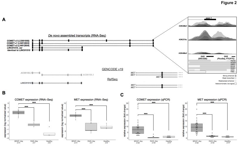 為了探索PTC中BRAF和RAS樣特異性lncRNA模式,首先在最近發(fā)表的來自22個(gè)甲狀腺活組織的RNA-Seq數(shù)據(jù)集中建立了從頭轉(zhuǎn)錄組裝的計(jì)算工作流程,定義一個(gè)新的PTC模型轉(zhuǎn)錄組。大于200nt低編碼潛能且與已注釋基因位點(diǎn)無重疊的轉(zhuǎn)錄本鑒定出454個(gè)新的lncRNA。與蛋白質(zhì)編碼基因類似,已知和新發(fā)現(xiàn)的lncRNA在患者和對(duì)照之間具有顯著差異的表達(dá)水平(FDR <0.05)。202個(gè)lncRNAs的表達(dá)在BRAF和RAS樣PTC之間存在顯著差異(其中77個(gè)在BRAF樣PTC中過表達(dá),125個(gè)低表達(dá)),其中60個(gè)未在公共數(shù)據(jù)庫中注釋(圖1D和1E;FDR <0.05)。因此,為鑒定尚未注釋的lncRNAs :i)在PTC中異常表達(dá),ii)在BRAF-和RAS樣亞組之間差異表達(dá),iii)在附近定位和iv)與已知癌癥驅(qū)動(dòng)基因高度相關(guān),作者使用“最近轉(zhuǎn)錄起始位點(diǎn)”(TSS)方法選擇mRNAs / lncRNAs對(duì)。有趣的是,基于這些標(biāo)準(zhǔn),將COMET(COrrelated-to-MET)鑒定為新的lncRNA,與MET癌基因正相關(guān)(r = 0.7)。
