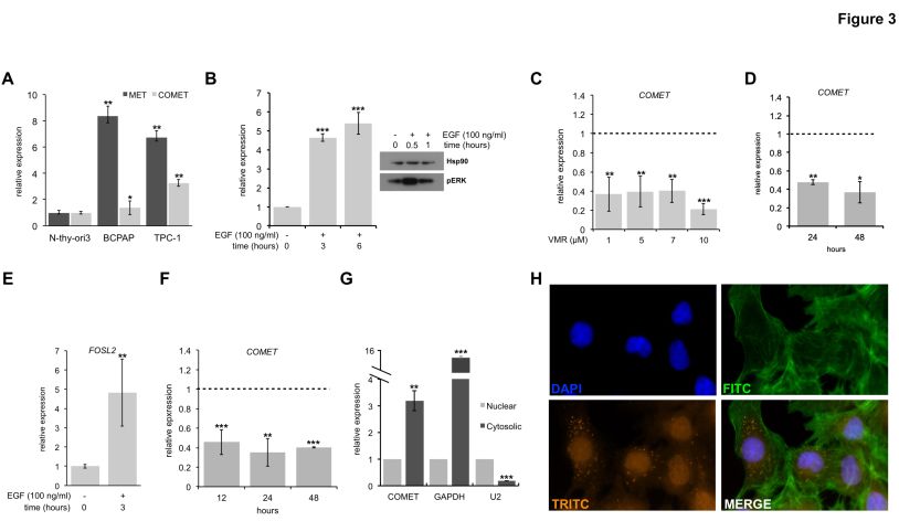 BRAF樣PTC的特征在于ERK介導(dǎo)的轉(zhuǎn)錄程序的過度激活。這一點(diǎn)促使研究COMET表達(dá)是否在MAPK激活下游被誘導(dǎo)。因此,用表皮生長(zhǎng)因子(EGF)刺激Nthy-ori 3-1細(xì)胞中的RAS-RAF-MEK-ERK途徑。MAPK途徑的誘導(dǎo) – 通過早期p-Erk增加證實(shí)(圖3B,右圖) – 隨后COMET水平顯著增加(圖3B,左圖)。相反,使用化學(xué)和遺傳方法抑制BRAF突變的BCPAP細(xì)胞系中的組成型活性途徑,通過用vemurafenib阻斷過度活化的B-Raf蛋白(圖3C)或BRAF基因KD(圖3D),顯著降低COMET水平。之后評(píng)估了COMET細(xì)胞定位,與qPCR偶聯(lián)的RNA分級(jí)分析顯示,與內(nèi)參蛋白質(zhì)編碼基因(GAPDH)類似,COMET在細(xì)胞質(zhì)RNA部分中具有明顯富集(圖3G)。此外,RNA FISH進(jìn)一步證實(shí)了這種新的NAT lncRNA的細(xì)胞質(zhì)定位(圖3H)。