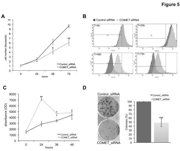為了驗(yàn)證COMET表達(dá)作為Ret和B-Raf蛋白組成型激活的下游轉(zhuǎn)錄事件,檢測(cè)了攜帶BRAFV600E突變(BCPAP)或RET基因重排(TPC-1)的PTC細(xì)胞系中的COMET水平與永生化正常甲狀腺細(xì)胞系(Nthy-ori 3-1)的比較 。正如所料,COMET以及MET在BRAF樣細(xì)胞系中的表達(dá)顯著高于正常細(xì)胞(圖3A); 顯示最高COMET表達(dá)水平的TPC-1細(xì)胞系用作下一步大多數(shù)表型測(cè)定的體外模型。