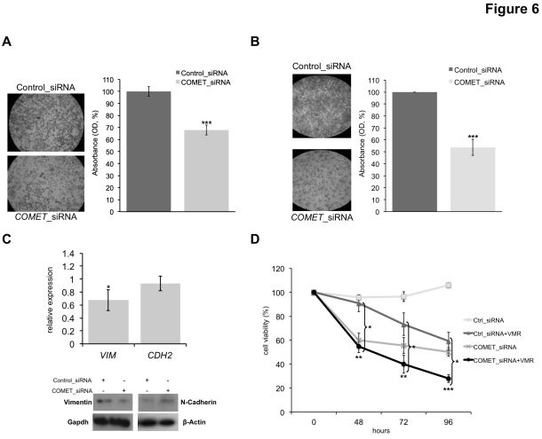 據(jù)報(bào)道,受體酪氨酸激酶(RTK),特別是c-Met受體的激活是腫瘤細(xì)胞逃避vemurafenib(VMR,維莫非尼)介導(dǎo)的突變體B-Raf蛋白抑制的機(jī)制。由于作者數(shù)據(jù)支持COMET可作為MET新的調(diào)節(jié)劑,猜測(cè)它是否也可能作用于BRAF突變的腫瘤細(xì)胞中的vemurafenib反應(yīng)機(jī)制。首先,與TPC-1細(xì)胞類似,評(píng)估COMET沉默對(duì)BRAFV600E突變的BCPAP細(xì)胞系的生存力(高達(dá)50%)具有強(qiáng)烈影響(圖6D),伴隨MET水平的下降。當(dāng)用VMR處理BCPAP時(shí),也表現(xiàn)出了類似的效果(高達(dá)60%的細(xì)胞存活率降低)。因此,將敲低COMET的BCPAP細(xì)胞暴露于VMR,以評(píng)估組合治療是否可發(fā)揮累加效應(yīng)。有趣的是,圖6D中數(shù)據(jù)表明,與對(duì)照細(xì)胞(即僅用VMR處理和/或用對(duì)照siRNA轉(zhuǎn)染的細(xì)胞,圖6D)相比,COMET敲低的 BCPAP細(xì)胞具有顯著增強(qiáng)的VMR敏感性,表明在BRAFV600E突變腫瘤中COMET是提高化療的新靶標(biāo)。