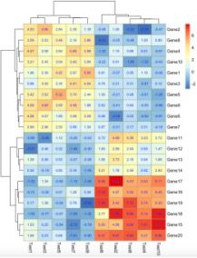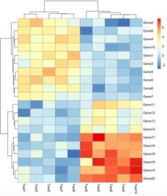 # 加載軟件包 library('pheatmap') # 生成繪圖用的數(shù)據(jù) test = matrix(rnorm(200), 20, 10) test[1:10, seq(1, 10, 2)] = test[1:10, seq(1, 10, 2)] + 3 test[11:20, seq(2, 10, 2)] = test[11:20, seq(2, 10, 2)] + 2 test[15:20, seq(2, 10, 2)] = test[15:20, seq(2, 10, 2)] + 4 colnames(test) = paste("Test", 1:10, sep = "") rownames(test) = paste("Gene", 1:20, sep = "")