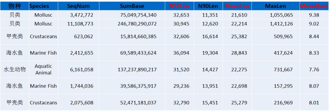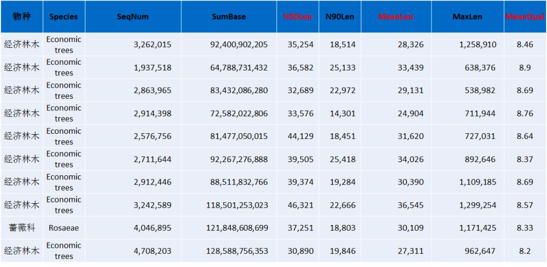 注:Species:分析的物種信息;SeqNum:各個長度范圍內(nèi)序列的數(shù)目;SumBase:指各個長度范圍內(nèi)序列的總長度;N50Len:reads N50長度;N90Len:readsN90長度;MeanLen:平均reads長度;MaxLen:最長reads長度;MeanQual:質(zhì)量值。