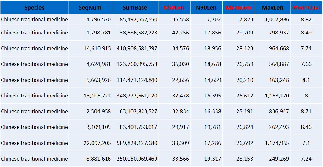 以上是總結(jié)的部分作物類、林木類、動物、水產(chǎn)和中藥材的下機(jī)數(shù)據(jù)結(jié)果展示,從以上的數(shù)據(jù)不難看出,平均raeds長度幾乎均在20Kb以上,最長reads高達(dá)1.6Mb以上(不同樣品DNA抽提難易程度不同,會造成一定的影響)。