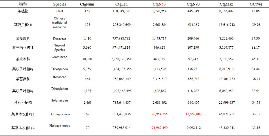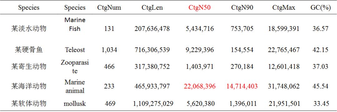注:Species:分析的物種信息;CtgNum:contig數(shù)目;CtgLen:contig總長度;CtgN50:contigN50長度;CtgN90:contigN90長度;CtgMax:最長contig長度;GC(%):GC含量占比。