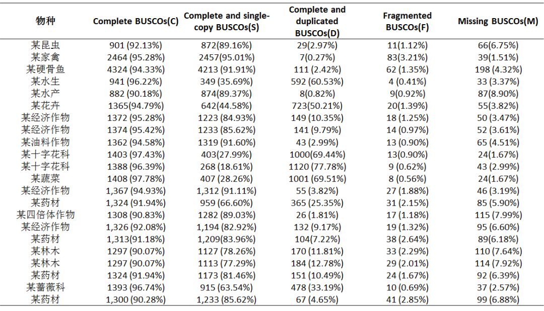 注:物種:分析的物種信息;Complete BUSCOs:找到完整基因數(shù);Complete and single-copy BUSCOs:其中單拷貝基因數(shù);Complete and duplicated BUSCOs:多拷貝基因數(shù);Fragmented BUSCOs:預(yù)測不完整基因數(shù);Missing BUSCOs:沒有預(yù)測出來的基因數(shù)。