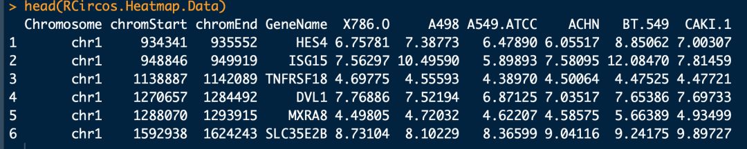 #?這個數(shù)據(jù)集中是6個不同樣本的基因表達(dá)量數(shù)據(jù),數(shù)據(jù)內(nèi)容如上圖,第一列?染色體編號,需要與第一步導(dǎo)入的染色體數(shù)據(jù)一致;第二列?基因在染色體片段起始位點;第三列?基因在染色體片段結(jié)束位點;第四列?基因名;第五列及以后?基因在不同樣本中的表達(dá)量