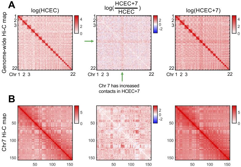 作者研究了一個(gè)正常核型的健康結(jié)腸粘膜構(gòu)建的細(xì)胞系及其同源的衍生細(xì)胞系,該衍生細(xì)胞系唯一異常是有一個(gè)額外的7號(hào)染色體拷貝(47,XY,+7)。作者使用Hi-C、RNA測序和蛋白質(zhì)組分析研究了非整倍化后結(jié)構(gòu)、功能的變化及其關(guān)系。7號(hào)染色體的增加導(dǎo)致了該染色體基因轉(zhuǎn)錄水平的增加,以及全基因組基因和蛋白表達(dá)的變化。Hi-C分析表明,7號(hào)染色體的額外拷貝反映在三倍體染色體間有更多的染色體間互作,且全基因組范圍內(nèi)出現(xiàn)了染色質(zhì)組織的變化,包括A/B區(qū)域化和拓?fù)潢P(guān)聯(lián)域(TAD)邊界的變化。最值得注意的是,4號(hào)染色體顯示出染色質(zhì)組織的嚴(yán)重缺失,而14號(hào)染色體包含一個(gè)大的A/B?compartment轉(zhuǎn)換區(qū)域,同時(shí)其中的基因表達(dá)發(fā)生改變。間期FISH檢測染色體涂染探針距離發(fā)現(xiàn)額外的7號(hào)染色體區(qū)域的核位置未發(fā)生變化。此外衍生細(xì)胞系中基因和蛋白富集在惡性轉(zhuǎn)化的關(guān)鍵信號(hào)通路,如HGF/MET-axis。總之,一個(gè)特異的染色體非整倍體對(duì)核結(jié)構(gòu)和功能有重大影響,無論是局域的還是全基因組的,此研究為分析具有復(fù)雜核型的癌癥核組織提供了一個(gè)基礎(chǔ)。