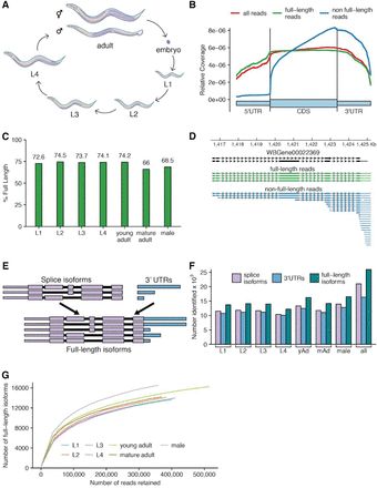 通過一系列的篩選標準,最終共計獲得2.9M 全長reads。綜合所有階段,最終鑒定到25,944 個全長轉(zhuǎn)錄本,其中20,987個轉(zhuǎn)錄本有唯一的可變剪接形式,16,325個轉(zhuǎn)錄本有唯一的3’UTRs ,平均每個階段鑒定到超過12,000條全長序列。在和線蟲數(shù)據(jù)庫進行注釋比對后,有12,613 轉(zhuǎn)錄本和10,711 個基因有全長數(shù)據(jù)支持,此外還鑒定到4,234個新基因和7,404 個新轉(zhuǎn)錄本。其中,發(fā)現(xiàn)9,900個已知可變剪接轉(zhuǎn)錄本和2,188個新的可變剪接轉(zhuǎn)錄本,對應1,349個基因。在這些新的剪接轉(zhuǎn)錄本中,有1,283個轉(zhuǎn)錄本在注釋的供體和受體剪接位點之間存在新的剪接位點,同時173個轉(zhuǎn)錄本還存在新的外顯子。