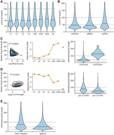 PolyA的長度,有可能和3’?UTR區(qū)域的polyA剪接位點(AAUAAA)有關。為了證明該推測,本文對不同polyA剪接位點類型(經(jīng)典的、可變的及無剪接位點)的polyA尾進行了長度統(tǒng)計,發(fā)現(xiàn)不同類型間存在顯著差異,且3’UTR區(qū)域不存在polyA剪接位點的,具有更長的polyA尾巴。在3’UTR區(qū)域,無polyA剪接位點的,其polyA長度中位數(shù)為58 nt,具有可變polyA剪接位點的,長度為46 nt;具有經(jīng)典的polyA剪接位點(AAUAAA),其長度中位數(shù)為48 nt。研究表明,polyA尾的長度與基因表達呈現(xiàn)負相關,即高表達的基因具有更短的polyA尾。對本研究數(shù)據(jù)進行統(tǒng)計發(fā)現(xiàn),在幼蟲發(fā)育階段發(fā)現(xiàn)有相似的負相關關系。例如,Y37E3.8基因的a轉(zhuǎn)錄本的表達要顯著高于b.1轉(zhuǎn)錄本,其polyA尾相較于b.1更短。polyA長度和基因表達水平的相關性R2?最高為0.1297。在成蟲發(fā)育階段,polyA長度和基因表達水平的相關性并不是很高。該結(jié)果表明,基因表達水平和polyA尾長度的負相關性具有階段性。最后,本文研究了polyA長度與內(nèi)含子保留可變剪接事件的相關性。研究表明,在人類細胞系中,polyA尾的長度與內(nèi)含子保留有關。在本文中,也發(fā)現(xiàn)polyA尾和內(nèi)含子保留事件呈現(xiàn)正相關。該結(jié)果表明,polyA尾在轉(zhuǎn)錄后調(diào)控存在一種保守機制,即在核轉(zhuǎn)錄本中,其擁有更長的polyA尾,而隨著轉(zhuǎn)移到內(nèi)質(zhì)網(wǎng)的過程中,polyA尾會進行脫腺苷化而進行轉(zhuǎn)錄后進程。