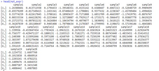 #矩陣,其中行對(duì)應(yīng)于與DMR相關(guān)的基因(即與DMR最近的基因,也可以叫做DMR關(guān)聯(lián)基因),矩陣中的值是每個(gè)樣品中每個(gè)基因的表達(dá)水平(對(duì)樣品中的每個(gè)基因的表達(dá)進(jìn)行了標(biāo)準(zhǔn)化)。