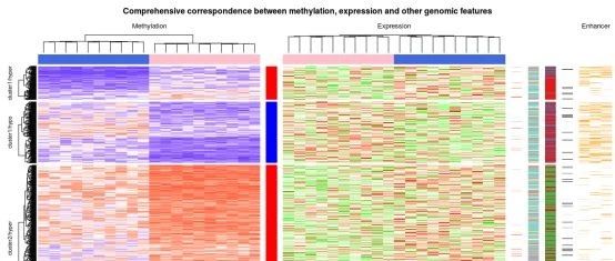 本次,我們將展示一個(gè)甲基化與表達(dá)譜聯(lián)合分析的熱圖。本著先學(xué)習(xí)再創(chuàng)造的態(tài)度,小編做了一下知識(shí)的搬運(yùn)工,本篇所有代碼均引用自:Zuguang Gu, Roland Eils and Matthias Schlesner,?Complex heatmaps reveal patterns and correlations in multidimensional genomic data,?Bioinformatics, 2016。