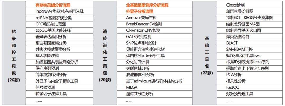 2)軟件:根據(jù)用戶需求我們提供了常用生信軟件,并封裝和串聯(lián)成常用分析模塊,通過單行命令即可完成很多常規(guī)分析內(nèi)容,如基因表達量計算、突變檢測、基因功能注釋等。