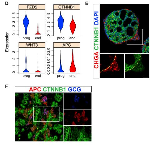 為了研究調(diào)節(jié)未分化祖細(xì)胞與內(nèi)分泌細(xì)胞之間整體平衡的遺傳途徑,基于上皮祖細(xì)胞及內(nèi)分泌細(xì)胞差異表達(dá)的基因,發(fā)現(xiàn)祖細(xì)胞中上調(diào)表達(dá)的轉(zhuǎn)錄本富集于Wnt活化相關(guān)的因子,包括配體WNT3和通路主要傳感器β-catenin,蛋白水平也類似(圖BDE);相反,APC作為WNT活性抑制分子,在內(nèi)分泌細(xì)胞中是上調(diào)的(圖D)。在小鼠胚胎中,APC蛋白在內(nèi)分泌半島區(qū)域唯一檢出,在上皮索中β-catenin 水平升高(圖 F)。
