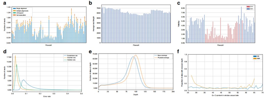 GM12878人B淋巴細胞采用PCR擴增和6kb片段篩選的文庫制備方案,共計獲得45,740,123條reads(圖1a),平均讀取長度為6373bp(圖1b)在流動細胞中是一致的,并且基于測序文庫的物理大小選擇非常接近預期。總數據量為273.4Gb,每個flow cell的平均產量為3.7Gb(圖1c)??傆?2,924,782個高質量clean reads的比對率為99.3%,唯一比對率為88.8%。