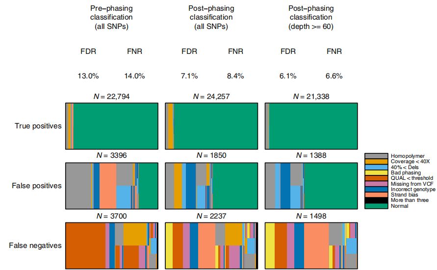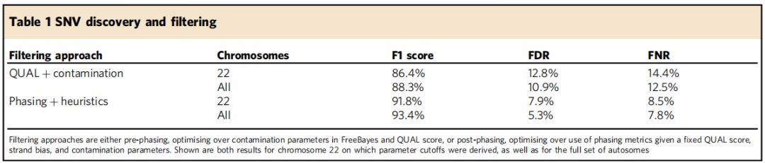 使用過濾器改進變異檢測,通過phasing和注釋過濾器(Post?phasing classification)顯著改善變異檢測,*佳結果F1評分為92.2%,F(xiàn)DR為7.1%,F(xiàn)NR為8.5%(表1,圖2中)。進一步考慮覆蓋深度>=60X的假定變異位點(基因組的85%)時,觀察到F1得分改善至93.6%,F(xiàn)DR為6.1%,F(xiàn)NR為6.6%(圖2右),這意味著減少或消除覆蓋深度偏差源(如PCR)的操作改進在提高z確性方面可以發(fā)揮一定作用。(百邁客目前ONT全基因組重測序和ONT全基因組甲基化測序建庫過程正是PCR-free建庫–direct-DNA建庫,一是可減少覆蓋深度偏好,有利于提高變異檢測z確度;二是可以保留堿基修飾信息,同時檢測甲基化修飾等信息)