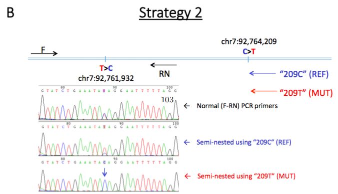 不出所料,ONT數據也鑒定到了具有預期雜合基因型的c.1076 G> A和c.3353 A> G變異。使用ONT reads對其他附近變異進行定相,以確認新生變異的遺傳和來源(圖3)。這2個新生突變被定相于一個199kb的block內,33條reads(6.1-18.9kb)跨越2個新生突變位點,11條reads包含新生突變等位基因,8條reads包含2個參考等位基因,表明突變的等位基因是順式的(來自于同一條染色體)。(NA12878數據中沒有reads跨越包含2個位點的突變等位基因。)使用一系列等位基因特異性PCR實驗證實來自ONT reads的新生等位基因的單倍型構象。相位區(qū)中的側翼位點表明,父系遺傳的單倍型出現(xiàn)了新生變異(圖3)。