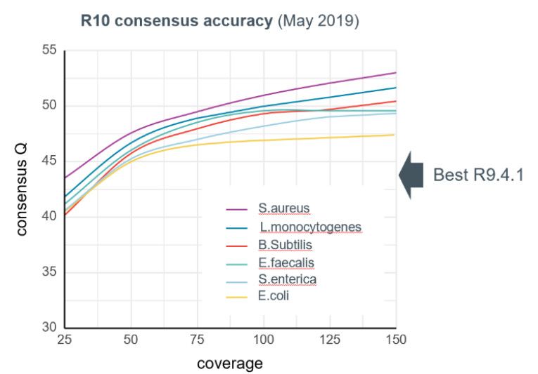 全新R10芯片在設計上采用了信號雙識別的策略,與R9.4.1芯片相比,有效提升原始序列,同聚物區(qū)域及Consensus序列準確性。在不使用二代數(shù)據(jù)的情況下,結合R9.4.1及R10的數(shù)據(jù),可獲得更高的準確性!目前R10芯片全球還處于小試研發(fā)階段,如果一切順利,三季度即可大規(guī)模商用,敬請期待!