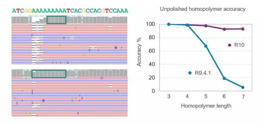 同聚物的識別準確性是大家一直都比較關心的問題,從ONT官方釋放的測試結果顯示,相比于R9.4.1,R10版本芯片能夠顯著提高其在同聚物區(qū)域的堿基識別準確度,并且?guī)缀醪粫肴笔уe誤(圖5)。