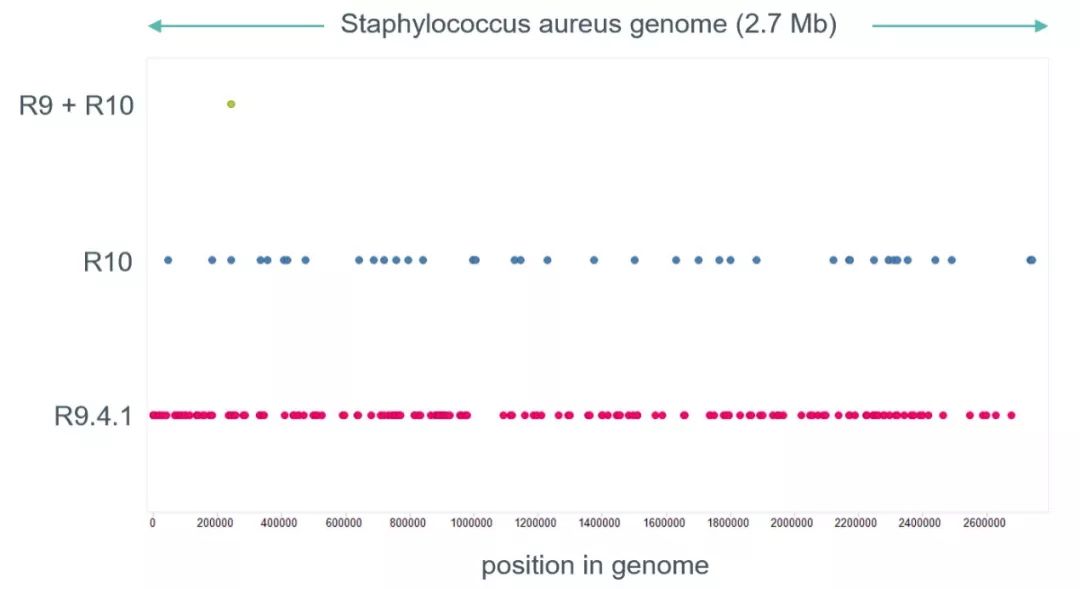 官方通過檢測同一樣本R10和R9.4.1中的錯誤在基因組上的情況,發(fā)現(xiàn)R9.4.1與R10的錯誤在基因組上分布并不是完全重疊的,通過兩種版本芯片的數(shù)據(jù)進行混合分析,可極大地提高序列的準確性(圖6)。這表明了,在不使用二代數(shù)據(jù)的前提下,后續(xù)也可考慮通過R10和R9.4.1數(shù)據(jù)組合的方式來提高結果的準確度!