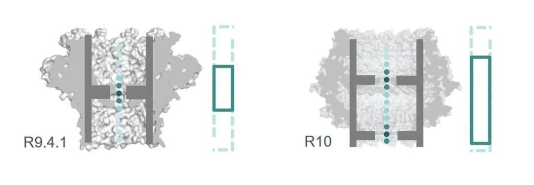新升級R10芯片大的更新是納米孔采用了雙讀取器(Reader)的設計,能夠對同一堿基進行兩次信號識別。理論上,同一堿基的識別次數(shù)為R9.4.1版本芯片2倍,由此來增加堿基的判斷率,減小隨機錯誤,并提高一致準確性。R10與R9.4.1測序方式比較如圖1