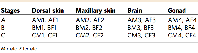轉(zhuǎn)錄組學(xué)分析:亞成年期、繁殖期、繁殖后期雌性及雄性的上頜皮膚、背部皮膚、腦、性腺組織(圖1)