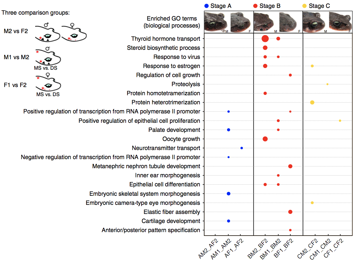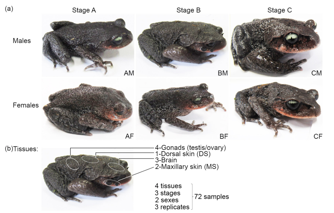 在雌雄異體的有性生物中,兩性之間在體型大小、形態(tài)結(jié)構(gòu)和功能等方面存在明顯差異的現(xiàn)象稱為性二態(tài)(Sexual dimorphism)。自然界普遍存在的性二態(tài)(如劍尾魚(yú)的劍狀尾和獅子的鬃毛等)一直是進(jìn)化生物學(xué)家關(guān)注的熱點(diǎn)問(wèn)題。兩棲動(dòng)物具有豐富的性二態(tài)特征,繁殖期的雄性雷山髭蟾在上頜的皮膚形成角質(zhì)刺,類(lèi)似于人類(lèi)的“胡子”,因此又被稱為“胡子蟾”,繁殖期過(guò)后,角質(zhì)刺外殼會(huì)脫落,而雌性則沒(méi)有這種特征。由于除了性染色體上的基因外,大多數(shù)的基因組在雄性和雌性之間是共享的,所以性二態(tài)往往是由基因在性別間差異性表達(dá)引起的。由于缺乏參考基因組,很少有研究能夠?qū)⑿詣e差異表達(dá)模式與特定的性二態(tài)特征聯(lián)系起來(lái),與性二態(tài)性狀相關(guān)的重要生物學(xué)過(guò)程和關(guān)鍵基因也一直難以破解。本文成功的建立了一個(gè)具有代表性的鋤足蟾亞目基因組,并對(duì)其皮膚來(lái)源的性二態(tài)性狀進(jìn)行了分子基礎(chǔ)的研究。