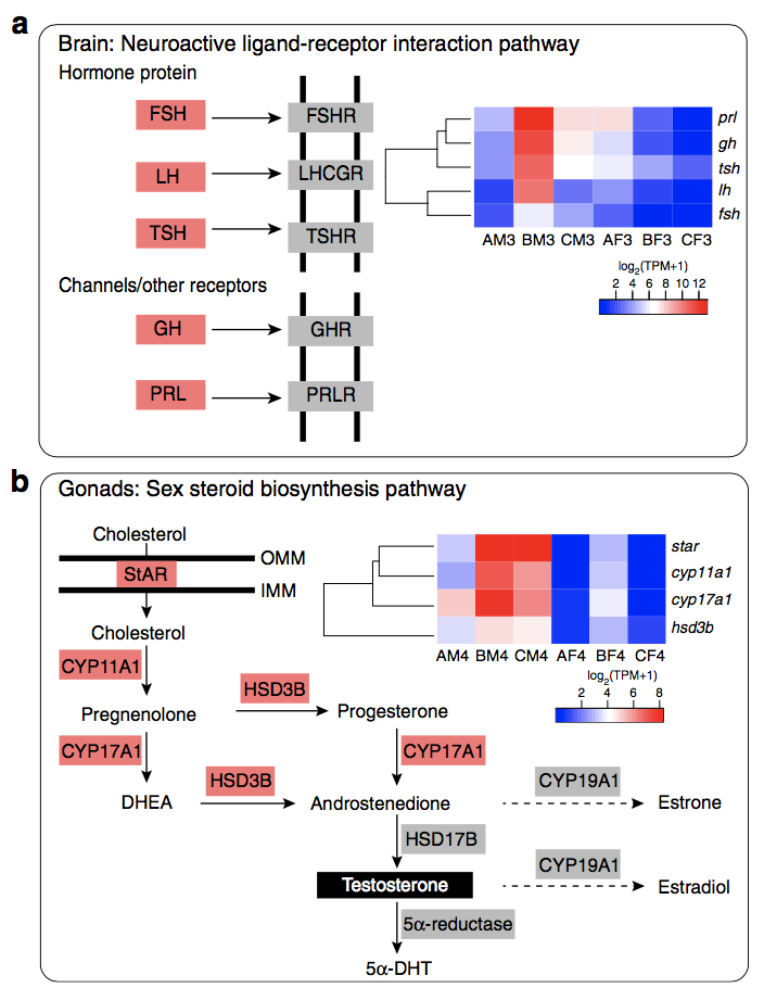 為了探討L.?leishanense中角質(zhì)刺的激素調(diào)節(jié),研究者對(duì)來(lái)自大腦和性腺的轉(zhuǎn)錄組數(shù)據(jù)進(jìn)行了測(cè)序(表2)。研究發(fā)現(xiàn)B期雄性和雌性之間的DEGs(BM3-BF3)和A期和B期雄性之間的DEGs(AM3-BM3)中的神經(jīng)活性配體-受體相互作用途徑顯著富集,在這些基因中,LH(黃體生成素)和FSH(卵泡刺激素)編碼肽激素,通過(guò)血液進(jìn)入性腺刺激類(lèi)固醇激素的合成(圖9)。相關(guān)基因的表達(dá)表明雄性在繁殖季節(jié)中下丘腦-垂體-性腺軸的激活。雄性精巢在不同時(shí)期的類(lèi)固醇激素生物合成途徑顯著豐富。在這條途徑中,編碼參與性類(lèi)固醇生物合成的酶的基因在B期雄性精巢中高度表達(dá)(圖9),表明B期雄性精巢中雄激素(睪酮和5α-DHT)生物合成水平較高。