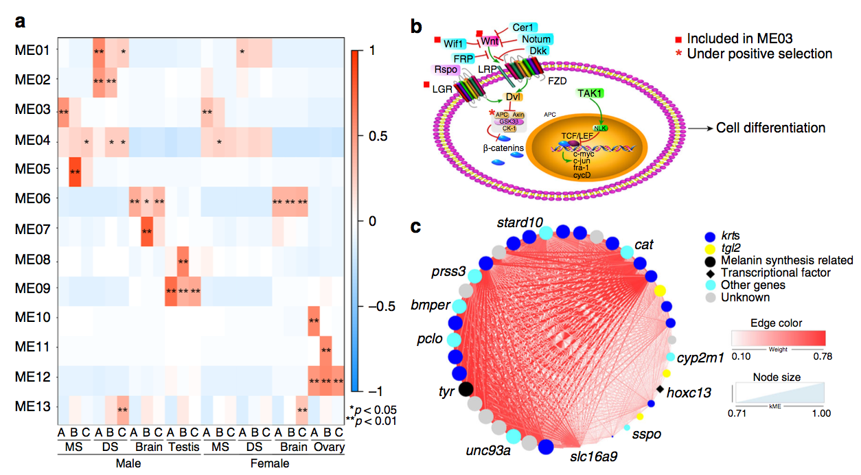 為了進(jìn)一步確定控制角質(zhì)刺生長(zhǎng)的關(guān)鍵基因,研究者分析了基因共表達(dá)網(wǎng)絡(luò),并使用加權(quán)基因共表達(dá)網(wǎng)絡(luò)分析(WGCNA)鑒定了基因模塊(genetic module),試圖找出與特定性狀相關(guān)的模塊(可能表現(xiàn)出相同生物活性的高度相關(guān)基因)。共表達(dá)網(wǎng)絡(luò)揭示了Wnt通路、角蛋白基因krt、黑色素合成相關(guān)的酪氨酸酶基因tyr以及轉(zhuǎn)錄因子hoxc13等參與形成角質(zhì)刺結(jié)構(gòu)(圖10)。