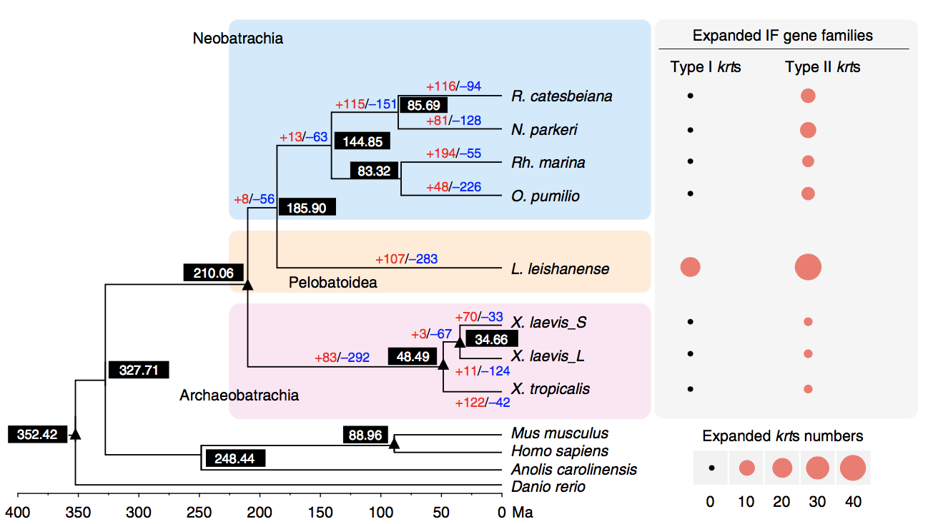 通過(guò)單拷貝直系同源基因進(jìn)行進(jìn)化樹(shù)的構(gòu)建,七個(gè)無(wú)尾目物種最近的共同祖先(MRCA)估計(jì)發(fā)生在2.101億年前(176.2-248.8 Ma),L. leishanense與新蛙亞目的物種在約185.9 Ma發(fā)生分化(圖6)。與MRCA相比,L. leishanense共有107個(gè)基因家族顯著擴(kuò)張(圖6),擴(kuò)張家族的基因主要富集于信號(hào)反應(yīng)類(lèi)型,包括嗅覺(jué)、刺激反應(yīng)和信號(hào)轉(zhuǎn)導(dǎo)。與細(xì)胞增殖、凋亡和存活等多種細(xì)胞功能的調(diào)節(jié)和對(duì)細(xì)胞外刺激的反應(yīng)中起重要作用的PI3K-Akt信號(hào)通路在L. leishanense中顯著擴(kuò)張。與免疫反應(yīng)相關(guān)生物過(guò)程相關(guān)基因發(fā)生顯著且特異性的擴(kuò)張。還需要進(jìn)一步的分析和實(shí)驗(yàn)數(shù)據(jù)來(lái)探討其生境適應(yīng)與免疫應(yīng)答相關(guān)基因擴(kuò)張的關(guān)系。