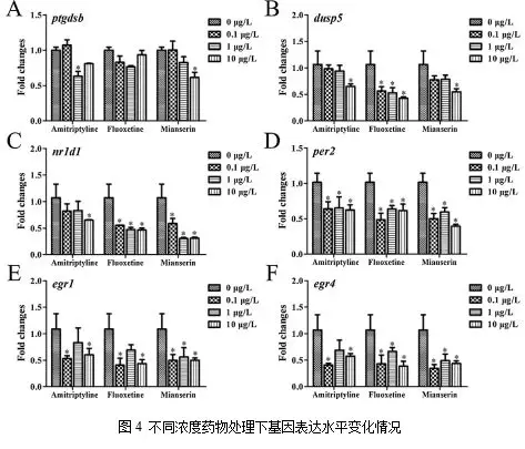 作者用三種不同濃度的抗抑郁藥(0.1、1和10 μg /L)處理斑馬魚胚胎,應(yīng)用qPCR試驗(yàn)確定6個(gè)選定的基因的濃度—應(yīng)答關(guān)系。結(jié)果表明,ptgdsb的mRNA水平只在1 μg /L阿米替林和10 μg /L米安色林處理組顯著降低;而dusp5表達(dá)水平在10 μg /L阿米替林和米安色林處理組以及所有氟西汀處理組中均顯著降低;除了在1和10 μg /L阿米替林處理組中的nr1d1表達(dá)水平未受抑制之外,nr1d1和per2在幾乎所有抗抑郁藥物處理組均受到顯著抑制。此外,兩個(gè)與早期生長(zhǎng)應(yīng)答相關(guān)的基因egr1和egr4在0.1和10 μg /L阿米替林處理組和所有米安色林處理組中表達(dá)下調(diào),egr4在所有氟西汀處理組降低,而egr1只在0.1和10 μg /L氟西汀處理組中表達(dá)降低(圖4)。