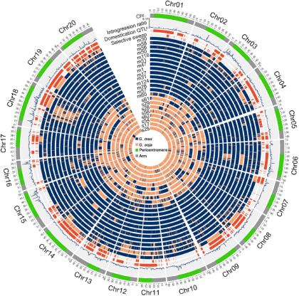 環(huán)形從外至內(nèi)依次表示(i)染色體臂(灰色),近著絲粒區(qū)(綠色) (ii)群體水平的基因滲入比例在各條染色體的分布(iii)馴化相關(guān)QTL位點(diǎn)在各條染色體的分布(紅色) (iv)選擇掃蕩區(qū)域在各條染色體的分布(紅色) (v)具有代表性的12份栽培大豆及10份野生大豆材料基因滲入?yún)^(qū)間的在各條染色體的分布:栽培大豆片段(藍(lán)色),野生大豆片段(橙色)