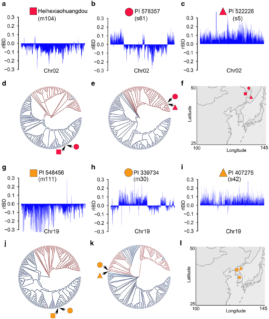 (a-c)黑河小黃豆, PI 578357和PI 52226三個(gè)材料中基因組成分在2號(hào)染色體的分布(d)基于2號(hào)染色體基因滲入?yún)^(qū)域SNP構(gòu)建的進(jìn)化樹揭示的PI 578357中PI 52226成分的起源(e)基于2號(hào)染色體非基因滲入?yún)^(qū)域SNP構(gòu)建的進(jìn)化樹揭示的PI 578357中黑河小黃豆成分的起源(f)上述三個(gè)材料的地理分布(g-i) PI 548456, PI 339734和PI 407275三個(gè)材料中基因組成分在19號(hào)染色體的分布(j)基于19號(hào)染色體基因滲入?yún)^(qū)域SNP構(gòu)建的進(jìn)化樹揭示的PI 339734中PI 548546成分的起源(k)基于19號(hào)染色體非基因滲入?yún)^(qū)域SNP構(gòu)建的進(jìn)化樹揭示的PI 339734中PI 407275成分的起源(l)上述三個(gè)材料的地理分布