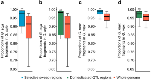 相較于在野生大豆種質(zhì)中檢測(cè)到的基因組其他區(qū)域,與選擇性掃描區(qū)域相應(yīng)區(qū)域中的栽培大豆片段比例顯著降低(圖5a)。相比之下,與栽培大豆基因組相比,選擇性掃除區(qū)中野生大豆片段在基因組其他區(qū)域的檢出率顯著降低(圖5c)。在栽培大豆或野生大豆相應(yīng)馴化QTL區(qū)域中,滲入片段比例比選擇性掃描區(qū)域中檢測(cè)到的小(圖5b,d)。這些結(jié)果表明雙向選擇,即自然選擇與人工選擇,對(duì)野生大豆和栽培大豆中滲入片段的保留具有不同的結(jié)果、影響。