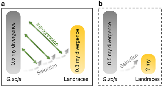 基因滲入被認(rèn)為是基因流的主要途徑,那么基因流如何在種群水平上影響馴化過(guò)程和大豆基因組的遺傳結(jié)構(gòu)?現(xiàn)有研究已分離出分別控制種子硬度和種皮開花的關(guān)鍵大豆馴化基因GmHs1-1和Bloom1(B1),圍繞GmHS1-1、Gmhs1-1和B1、b1基因座的兩個(gè)選擇性掃除區(qū)域中的SNP分析系統(tǒng)發(fā)育關(guān)系發(fā)現(xiàn)基因滲入現(xiàn)象在這兩個(gè)區(qū)域均有存在??紤]到野生大豆和栽培大豆亞種的系統(tǒng)發(fā)育差異,在研究種群中兩個(gè)馴化基因位點(diǎn)檢測(cè)到的選擇性掃描區(qū)域和單倍型的混合將被視為亞種群間基因流動(dòng)的進(jìn)一步證據(jù)。