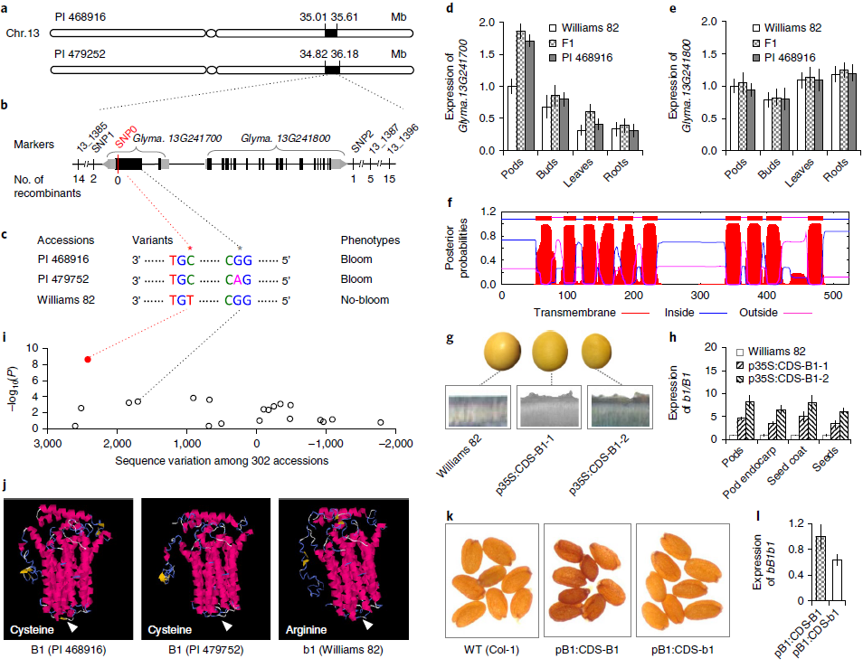 隨后對RIL的兩個子集進行處理,以通過測序(GBS)進行基因分型。基因型和表型數(shù)據(jù)的組合在PI 468916和PI 479752中在13號染色體上種皮開花的基礎(chǔ)上定義了一個區(qū)域(圖2a),該區(qū)域與先前映射的B1區(qū)域重疊,表明這兩個種質(zhì)由B1基因座控制。在映射區(qū)域內(nèi)的其他標記用于鑒定兩個RIL群體中與B1基因座之間的重組體,最后根據(jù)大豆參考基因組序列將B1基因座精細映射到一個包含兩個基因(Glyma.13G241700、Glyma.13G241800)的14.5 kb區(qū)域(圖2b)。對三個親本系的兩個基因進行測序,Williams 82和兩個大豆親本之間的差異只有一個SNP位點,即Glyma13G241700的編碼序列(CDS)中的一個(C到T)點突變,導致氨基酸從半胱氨酸變?yōu)榫彼幔▓D2c)。花后5周,Glyma.13G241700在發(fā)育中的豆莢中最高表達,其在PI 468916和(Williams 82×PI 468916)F1中的表達水平相似,但均明顯高于Williams 82(圖2d)。相比之下,兩個親本中的Glyma.13G241800和F1的表達水平?jīng)]有顯著差異(圖2e)。這些觀察結(jié)果表明,雙親中的Glyma.13G241700最有可能成為B1的候選基因,預計B1編碼跨膜轉(zhuǎn)運蛋白樣蛋白(圖2f)。