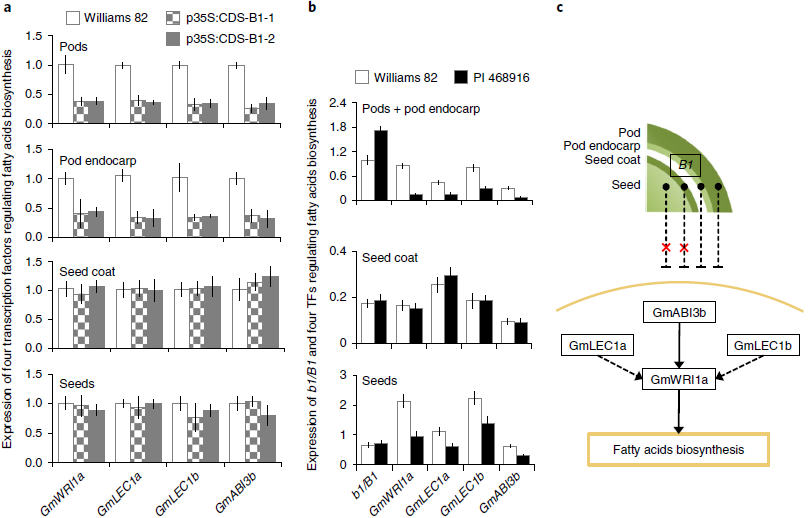 為了闡明B1介導降低種子油含量的機制,分析了Williams 82發(fā)育豆莢、豆莢內(nèi)果皮、種皮和種子中四種轉(zhuǎn)錄因子GmWRI1a,GmLEC1a,GmLEC1b和GmABI3b的表達水平。B1和PI 468916的T1轉(zhuǎn)基因植物在R5階段過表達。這些轉(zhuǎn)錄因子上調(diào)了大豆種子中脂肪酸的生物合成,其表達水平與種子油含量呈正相關(guān)。在B1的過表達下發(fā)育中的豆莢和豆莢果皮中四種轉(zhuǎn)錄因子的表達水平均顯著降低而在發(fā)育中的種皮和種子中未觀察(圖4a)。Williams 82和PI 468916之間的B1 / b1表達模式與之呼應(圖4b)。表明B1基因不影響大豆種子中脂肪酸的合成,是通過下調(diào)脂肪酸生物合成影響莢果(圖4c)。