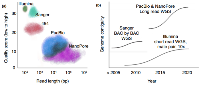 圖1 不同測序技術(shù)讀長,準(zhǔn)確性及基因組連續(xù)性評估