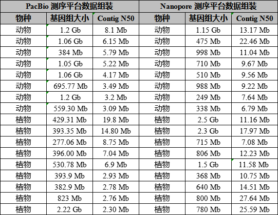 首先通過百邁客三代Nanopore和PacBio平臺相關(guān)物種測序讀長(表1)及組裝結(jié)果的比較(表2),進(jìn)一步通過我們的實際案例來看一下Nanopore測序平臺在基因組組裝中的優(yōu)勢。