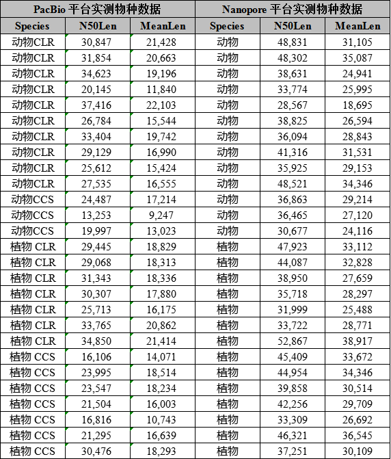 通過雙平臺實測數(shù)據(jù)的比較分析: Nanopore平臺平均讀長為28.5 Kb左右,Reads N50平均讀長 38Kb左右;PacBio CLR平均讀長20 Kb左右,Reads N50平均讀長 28Kb左右;CCS平均讀長12-15 Kb,Reads N50 16~18Kb,發(fā)現(xiàn)Nanopore比PacBio平臺讀長高10 Kb左右,而PacBio CCS模式讀長遠(yuǎn)低于CLR模式。