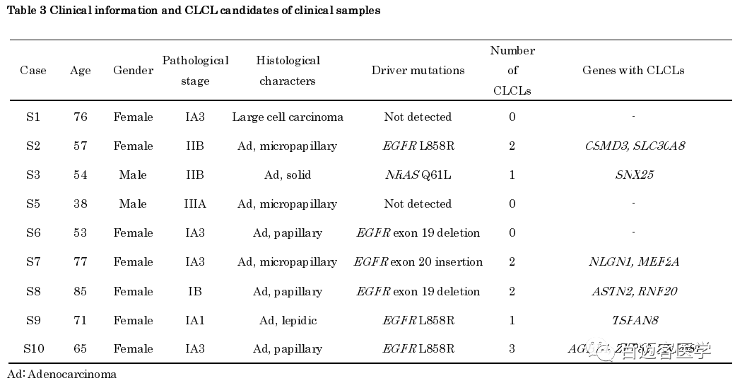 為了檢查臨床肺癌肺腺癌病例中是否也存在CLCL,對9名日本肺腺癌患者的手術(shù)標(biāo)本進(jìn)行了類似的PromethION全基因組測序(表3)。表3中顯示了每個患者所檢測到的驅(qū)動基因突變。平均每個case生成了43,953,136,203 bp的序列(深度大于10倍)。對于S10病例,還對正常組織標(biāo)本進(jìn)行了測序,以消除可能的正常組織變異和源自比對錯誤的可疑CLCL。