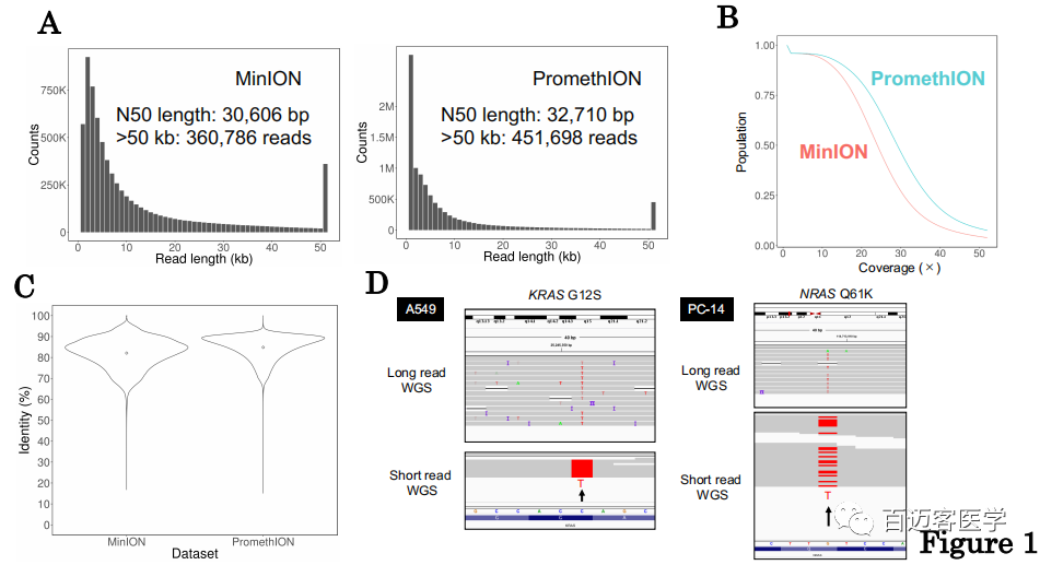 PromethION vs MinION:為了探究PromethION測序是否與MinION測序兼容,比較了獲得的兩個數(shù)據(jù)集的特征。Reads長度的總體分布是相似的(圖1A)。這兩個數(shù)據(jù)集都包含很大一部分超過50 kb的長讀長reads(MinION:360,786個讀,PromethION:451,698個),20X以上測序深度覆蓋了超過50%的人類基因組區(qū)域(圖1B),兩個數(shù)據(jù)集均顯示了超過80%的整體保真度(圖1C),與先前的研究相似。PromethION平臺各項(xiàng)指標(biāo)稍微好一點(diǎn)。結(jié)論:PromethION是用于整個癌癥基因組測序的有效分析方法。