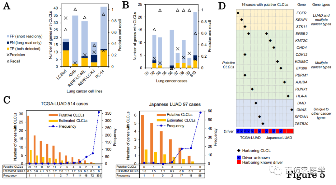盡管對于所有細(xì)胞系和臨床樣品,使用短讀長數(shù)據(jù)分別估計21%和72%的CLCL檢測z確度和重復(fù)檢出率,但將構(gòu)建的分析流程應(yīng)用于514個 TCGA肺腺癌(TCGA-LUAD)和97個日本肺腺癌(Japanese LUAD)樣本全外顯子組測序數(shù)據(jù),通過分別從TCGA-LUAD和日本LUAD病例中進(jìn)行軟切割reads分析,共檢測到269個和50個具有串聯(lián)重復(fù)結(jié)構(gòu)的連接點(diǎn),這些結(jié)構(gòu)可能對應(yīng)于CLCL(每個病例1至29個基因)??傆嫃?55(30%)TCGA-LUAD和39(40%)日本LUAD病例中提取了候選CLCL(圖5C)。
