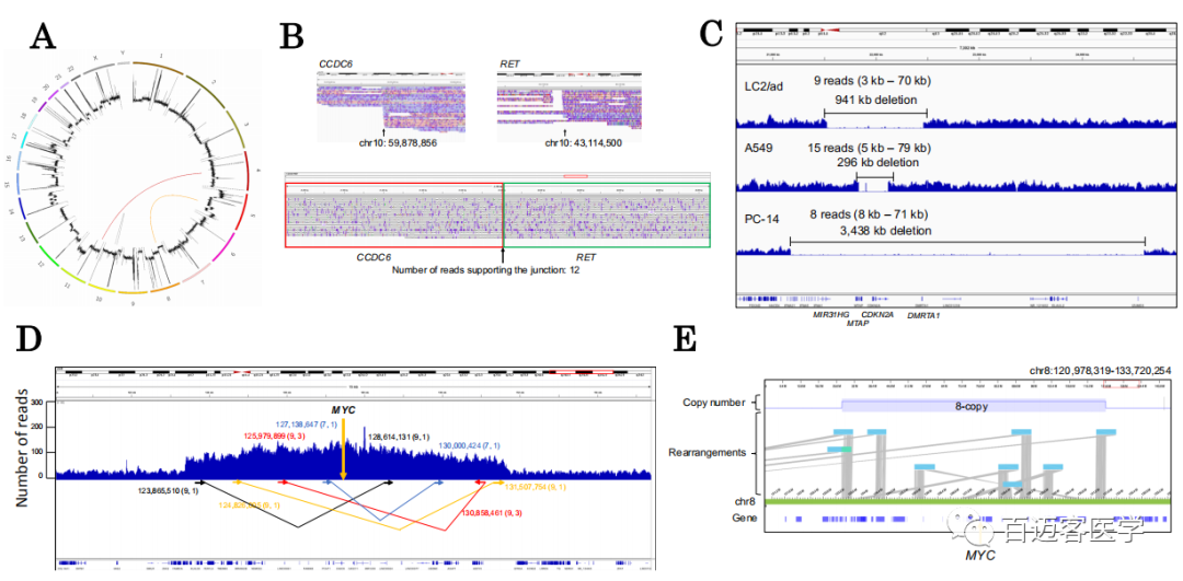 使用長讀長測序數(shù)據(jù),嘗試檢測比點(diǎn)突變大的結(jié)構(gòu)畸變(圖2A)。從LC2/ad的MinION/PromethION數(shù)據(jù)集中,成功鑒定出12條reads與CCDC6-RET融合基因的junction位點(diǎn)直接重疊,這是該細(xì)胞系已知的“癌癥驅(qū)動突變”(圖2B)。進(jìn)一步嘗試鑒定大的缺失,前人報道抑癌基因CDKN2A基因周圍有大的缺失,發(fā)生在LC2/ad,A549和PC-14細(xì)胞中。使用這項(xiàng)研究中的MinION/PromethION數(shù)據(jù)集,我們再次確認(rèn)了該基因在各細(xì)胞中的缺失(圖2C)。此外,每個CDKN2A缺失的√確連接點(diǎn)在細(xì)胞類型之間是不同的。