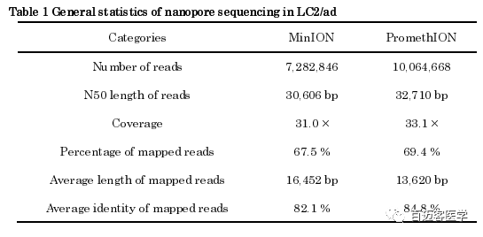 使用納米孔測序儀MinION及其更高通量PromethION平臺進(jìn)行了長讀長全基因組測序分析。首先通過對LC2/ad的基因組進(jìn)行測序來驗(yàn)證新型PromethION儀器的性能,LC2/ad是源自日本肺腺癌患者的肺癌細(xì)胞系。作為參考,作者從總共33個MinION runs(R9.5)中收集了全基因組測序數(shù)據(jù),以31×的總測序深度覆蓋了整個人類基因組,共有7,282,846條reads(93,813,338,154 base)。reads的*大長度和N50長度分別為2,495,160 bp和30,606 bp。采用Minimap2將67.5%的reads比對到人類參考基因組UCSC hg38。比對上的reads平均長度為16,452 bp,總體序列一致性平均為82%,比以前的長讀長人類癌癥基因組測序分析顯著增長。PromethION測序需要大約三個flowcells才能產(chǎn)生總共10,064,668個reads(100,440,433,160 bp),總覆蓋率為33x,Reads的*大長度和N50長度分別為987,834 bp和32,710 bp。使用Minimap2,將69.4%的讀數(shù)定位到參考基因組。比對上的reads平均長度為13,620 bp,平均一致性為84.8%。值得注意的是,對于31X 93G數(shù)據(jù)量,PromethION平臺不需要制備多個文庫33次測序,因此與MinION相比,PromethION所需的起始DNA總量可減少十倍以上。
