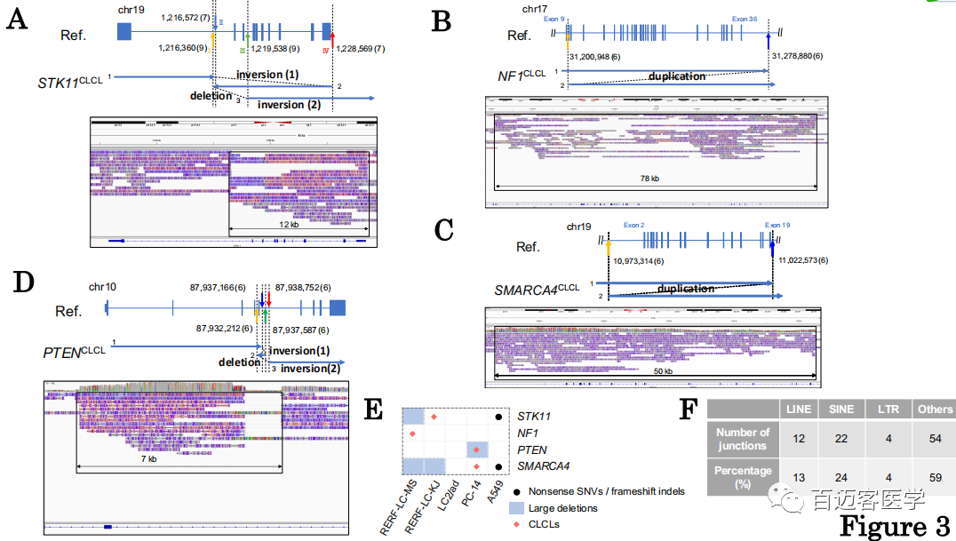 在其他細(xì)胞系中也成功鑒定出以下數(shù)量的CLCL:LC2/ad中有16個,A549中有1個,RERF-LC-KJ中有7個,RELF-LC-MS中有7個,PC-14中有11個。重要的是,CLCLs甚至出現(xiàn)在關(guān)鍵的癌癥基因中,例如STK11,NF1,SMARCA4和PTEN基因。異常的結(jié)構(gòu)各不相同,并且由于其復(fù)雜的結(jié)構(gòu)和受累區(qū)域的大小,傳統(tǒng)的基于短讀長測序分析的方法不易檢測到它們中的大多數(shù)。相對簡單的一種是在RERF-LC-MS細(xì)胞的NF1基因中檢測到的(圖3B),內(nèi)含子9(chr17:31,200,948)和最后一個外顯子36的下游區(qū)域(chr17:31,278,880;在交界處有6條reads支持)之間的串聯(lián)串聯(lián)重復(fù)。在另一種情況下,SMARCA4 CLCL的結(jié)構(gòu)顯示出從內(nèi)含子1(chr19:10,973,314)到內(nèi)含子20(chr19:11,022,573;在交界處有8條reads支持;圖3C)。在PC-14中的PTEN結(jié)構(gòu)中發(fā)現(xiàn)了更復(fù)雜的情況,該CLCL是倒位和缺失的組合(圖3D)。在這些相對簡單的情況下,將Illumina短reads重新映射到已發(fā)現(xiàn)的junction位點(diǎn)可驗(yàn)證重建結(jié)構(gòu)的√確識別。