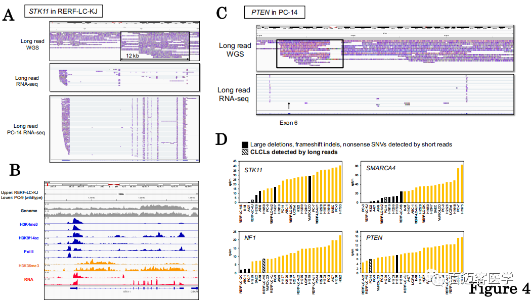 在很多細(xì)胞類型的許多關(guān)鍵基因中發(fā)現(xiàn)了新的CLCL型畸變后,立即提出的問題是它們以何種方式產(chǎn)生轉(zhuǎn)錄或表觀基因組后果。全長轉(zhuǎn)錄組測序-使用MinION重新生成并分析了全長cDNA測序數(shù)據(jù)。并利用了以前的Illumina短讀長RNA-seq和ChIP-seq數(shù)據(jù)。在RERF-LC-KJ細(xì)胞中,短讀長序列數(shù)據(jù)表明STK11轉(zhuǎn)錄物在內(nèi)含子1處異常剪接,并且轉(zhuǎn)錄躍遷到CLCL結(jié)構(gòu)之前。代表全長轉(zhuǎn)錄本的MinION reads進(jìn)一步指明√確的剪接模式和轉(zhuǎn)錄終止位點(diǎn)(圖4A)。對于幾乎所有的轉(zhuǎn)錄本,第一次剪接均發(fā)生在異常位置(來自chr19:1,216,268),并且轉(zhuǎn)錄根據(jù)CLCL結(jié)構(gòu)發(fā)生(RNA-seq reads涵蓋從chr19:1,216,572至chr19:1,228,569的斷點(diǎn)II-IV)。在下游CLCL區(qū)域內(nèi)也觀察到一些異常轉(zhuǎn)錄(中間圖,圖4A)。在STK11基因是野生型的PC-14細(xì)胞中未觀察到這種異常轉(zhuǎn)錄模式(下圖,圖4A)。