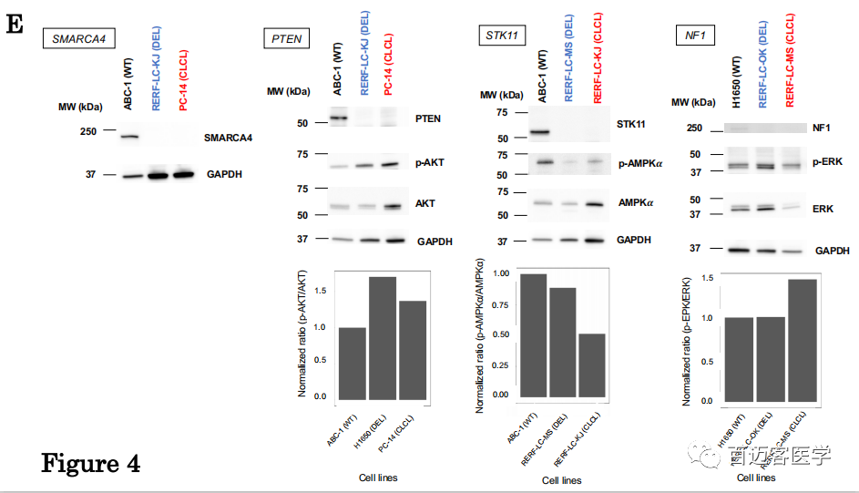 為了解決CLCL的生物學(xué)意義,作者研究了受CLCL影響的基因座如何引起蛋白質(zhì)表達(dá)水平及其相關(guān)信號通路變化。蛋白質(zhì)印跡WB分析發(fā)現(xiàn)STK11,NF1,SMARCA4和PTEN的蛋白質(zhì)在這些基因中帶有CLCL的細(xì)胞中完全丟失了(圖4E)。進(jìn)一步檢查了下游蛋白的激活狀態(tài),在所有檢查的case中均觀察到了預(yù)期的信號通路破壞。磷酸化的AKT(phospho-AKT)相應(yīng)地激活mTOR信號通路,而PTEN抑制AKT的磷酸化。觀察到phospho-AKT異常上調(diào),反映了PC-14細(xì)胞(PTEN-CLCL)中PTEN的功能喪失。AMPK是在維持細(xì)胞動態(tài)平衡中起重要作用的基因,AMPK蛋白在其α亞基處的磷酸化被STK11激活。在RERF-LC-KJ細(xì)胞(STK11-CLCL)中,其激活受到損害。NF1基因是RAS的負(fù)調(diào)控因子,位于RAS信號通路下游的磷酸化ERK在RERF-LC-MS細(xì)胞(NF1-CLCL)中異常上調(diào)。無論是由于常規(guī)畸變還是CLCL,相應(yīng)基因的蛋白質(zhì)明顯丟失,但其后果仍會根據(jù)情況而有所不同。例如,即使STK11蛋白在RERF-LC-MS細(xì)胞(STK11缺失)和RERF-LC-KJ細(xì)胞(STK11-CLCL)中類似地消失,在RERF-LC-KJ細(xì)胞(STK11-CLCL)中磷酸-AMPKα的增強(qiáng)比例也更高。RERF-LC-OK(NF1-缺失)細(xì)胞系中NF1蛋白影響幾乎無法檢測到,而對RERF-LC-MS細(xì)胞(NF1-CLCL)的影響卻很明顯。表明,其他途徑有時可以彌補(bǔ)關(guān)鍵蛋白的缺失。